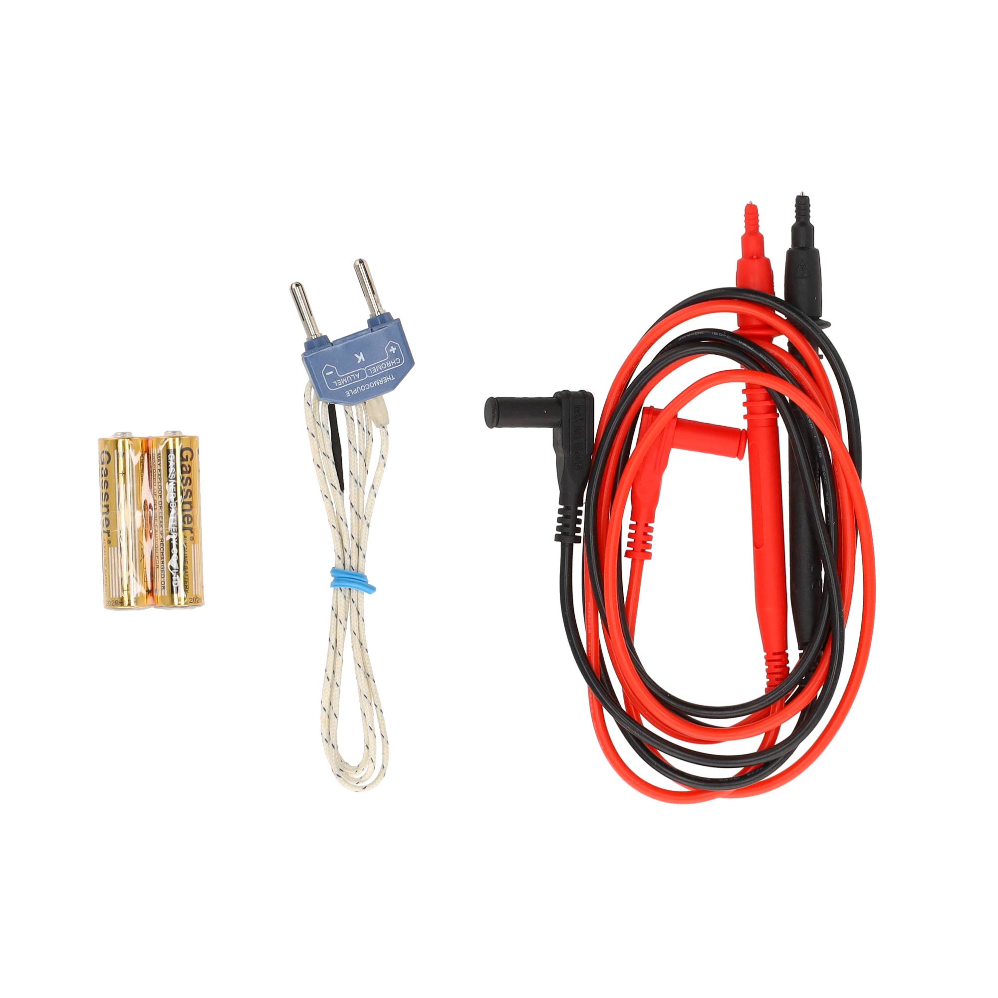 - Meegeleverd: Meetkabels, Temperatuursensor, Draagtas en Batterijen